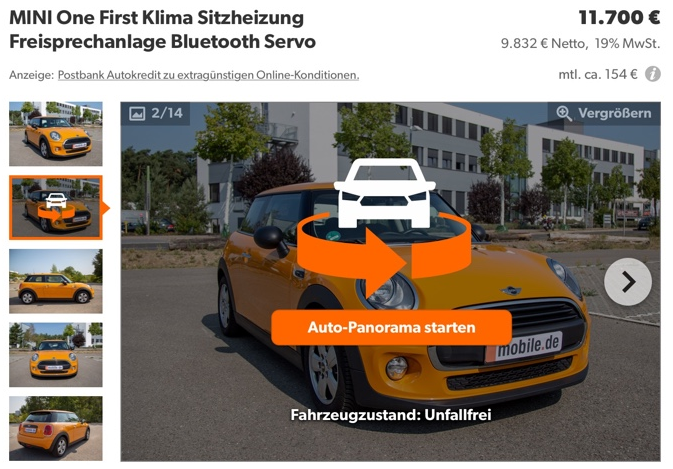 Berlin/Dreilinden, 28. September 2018 – Ab sofort können Händler auf mobile.de vollständige Rundum- und Innensichten ihrer Fahrzeuge präsentieren. Das mobile.de Auto-Panorama soll dem Handel dabei helfen, sich im Wettbewerbsumfeld besser zu positionieren, und den Abverkauf beschleunigen. Denn laut einer aktuellen Umfrage erleichtern 360-Grad-Aufnahmen des Fahrzeugs neun von zehn Autokäufern die Kaufentscheidung* deutlich. Dem mobile.de Leistungsversprechen nach steht die neue Funktionalität ab September Komfort-und Premium-Händlern zur Verfügung.