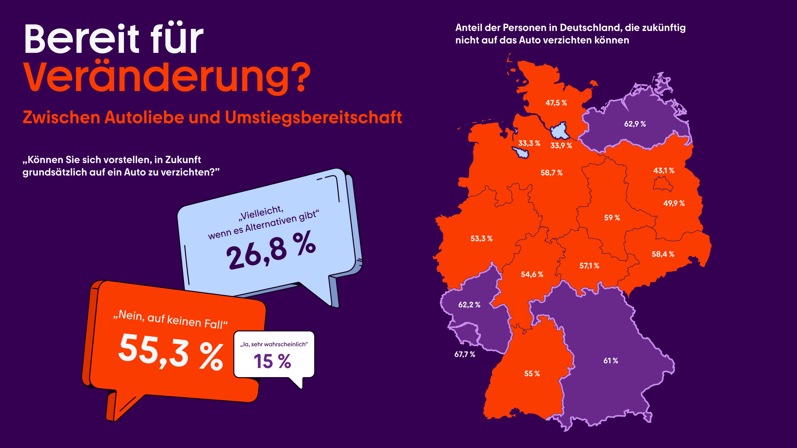 Kein Wunder, dass die große Mehrheit der Befragten (80,7 Prozent) angibt, sich ohne Auto (eher) eingeschränkt zu fühlen. Am höchsten ist dieser Wert im Saarland (96,8 Prozent). Auch in Rheinland-Pfalz (92,6 Prozent) und Bayern (84,8 Prozent) fühlen sich die Menschen ohne Auto am wenigsten mobil. Besonders bemerkenswert: Selbst in den Großstädten Berlin (63,4 Prozent) und Hamburg (59,5 Prozent) ist der Anteil weiterhin hoch.