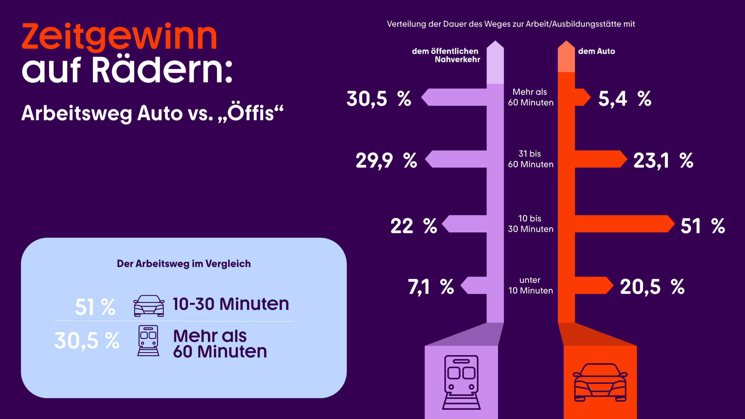 - Zeitfalle ÖPNV: 30,5 Prozent brauchen mit Bus und Bahn über eine Stunde zur Arbeit, mit dem Auto sind es nur 5,4 Prozent.