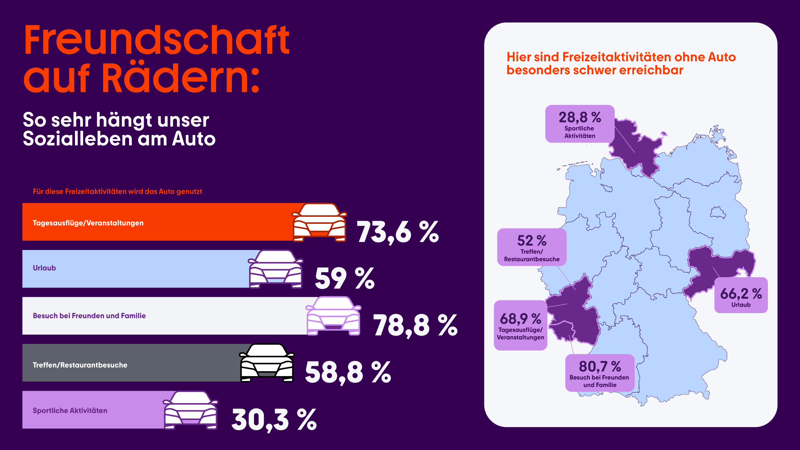 - Sozialleben auf vier Rädern: 78,8 Prozent nutzen das Auto, um Freunde und Familie zu besuchen. Ohne Pkw wären diese Ziele für 57,9 Prozent kaum erreichbar.