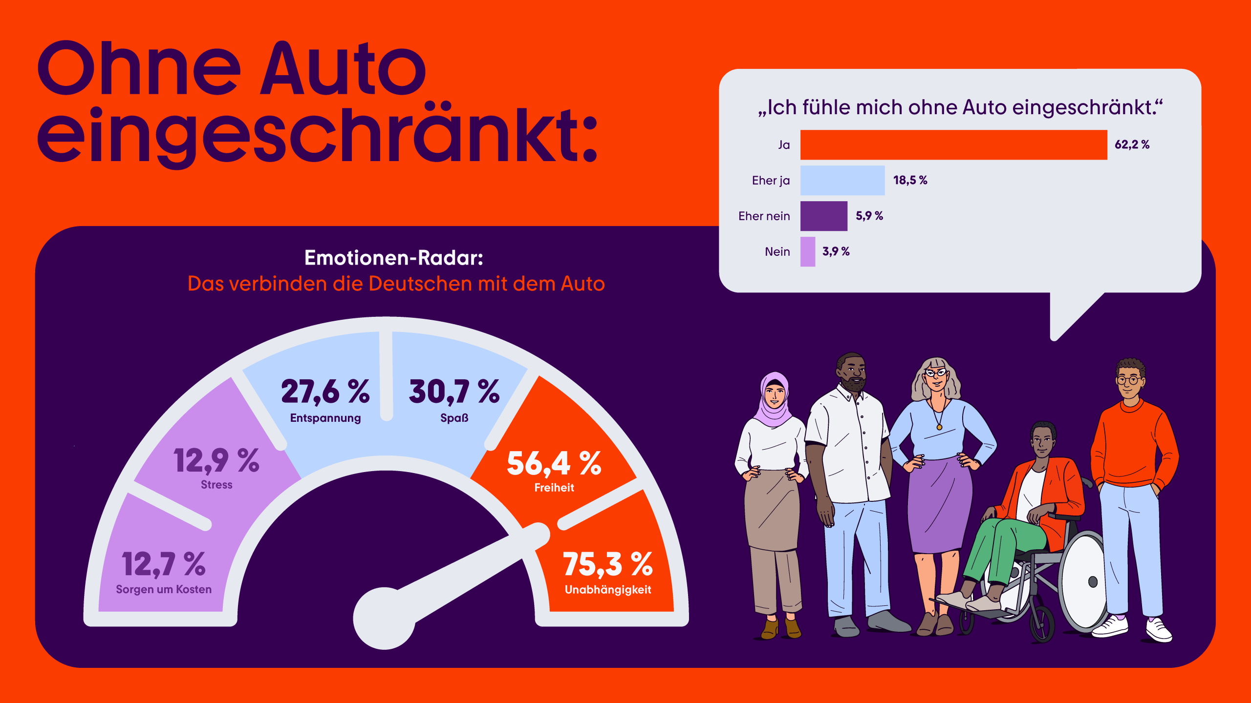 - Abhängigkeit auch in der Stadt: Selbst in Großstädten wie Berlin (63,4 Prozent) und Hamburg (59,5 Prozent) fühlen sich die meisten Menschen ohne Auto eingeschränkt.
