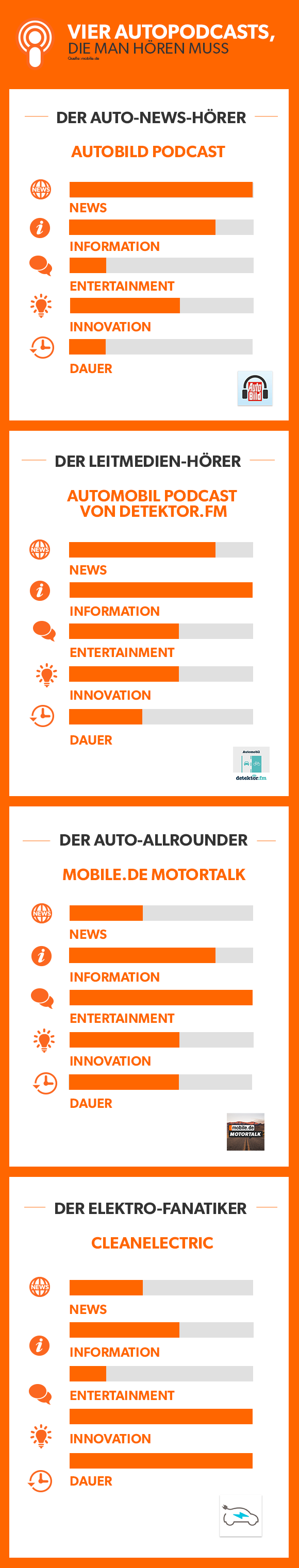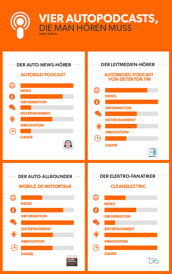 Umfassende News-Qualität bieter der AutoMobil Podcast von detektor.fm. Immer montags wird eine neue Folge zu vielfälligen Mobilitätsthemen vom autonomen Fahren über ÖPNV bis hin zur Oldtimerzulassung veröffentlicht. Häufig ist ein Experte zu Gast oder wird per Telefon zugeschaltet. Das Format ist mit 5 bis 10 Minuten kompakt gehalten.